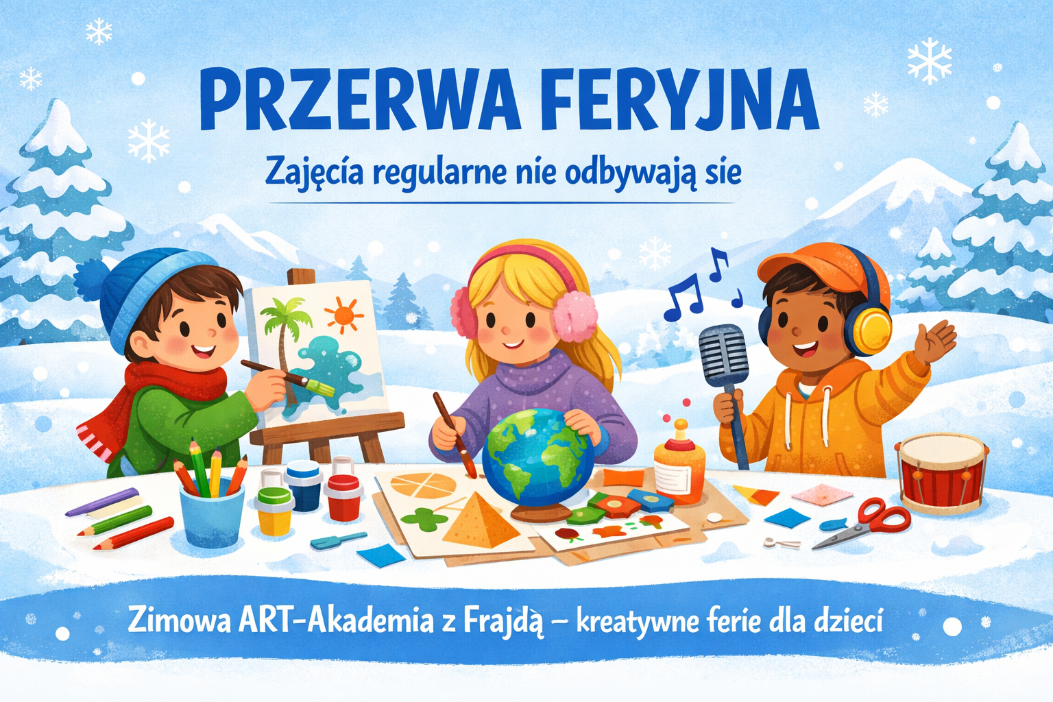 Jednocześnie informujemy, że w czasie ferii odbywa się Zimowa ART-Akademia z Frajdą – półkolonie artystyczne skierowane do dzieci w wieku 6–12 lat. Jest to propozycja aktywnego i twórczego spędzenia ferii, łącząca zajęcia artystyczne, edukacyjne i animacyjne, realizowane pod opieką wykwalifikowanej kadry.